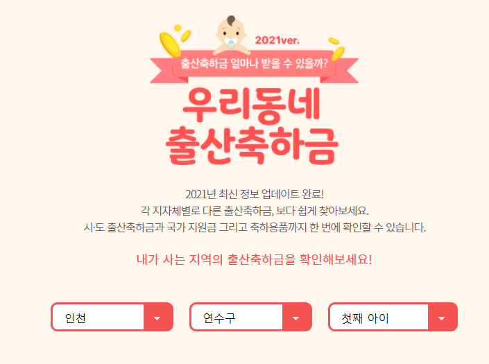 우리 동네 지역에서 아이를 낳으면 어떤 혜택이 있는지 궁금하지 않으십니까? 전국 시군구의 축하금을 비롯하여 어떤 선물과 서비스 등이 있는지 각종 출산 혜택을 한눈에 확인할 수 있습니다.