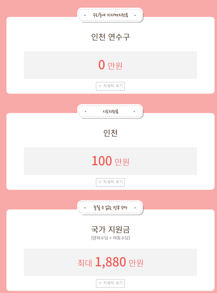 내가 속해 있는 지역을 선택을 한 후 몇번째 자녀인지 선택할 경우 지자체 지원금, 시도지원금, 정부 수당의 정보를 확인할 수 있습니다. 제가 선택한 곳은 인천 연수구 인데 첫째 자녀일 경우 지자체 지원금은 없지만 시도 지원금에서 100만원이 나오는걸 알수 있습니다. 2021년도 버전이니 2022년도에 새로운 정책이 나오면 바뀔 수도 있지만 미리 알고 알아볼 수 있어서 좋은거 같습니다.